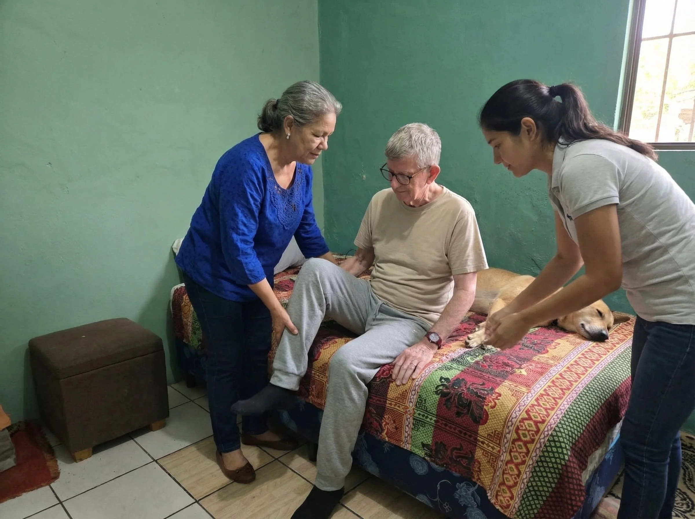 Neighbors helping me move safely onto the bed during my recovery—an everyday act of care I will never forget.